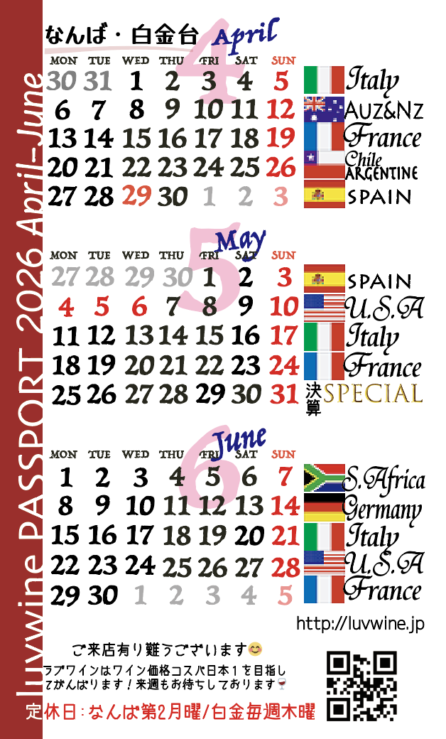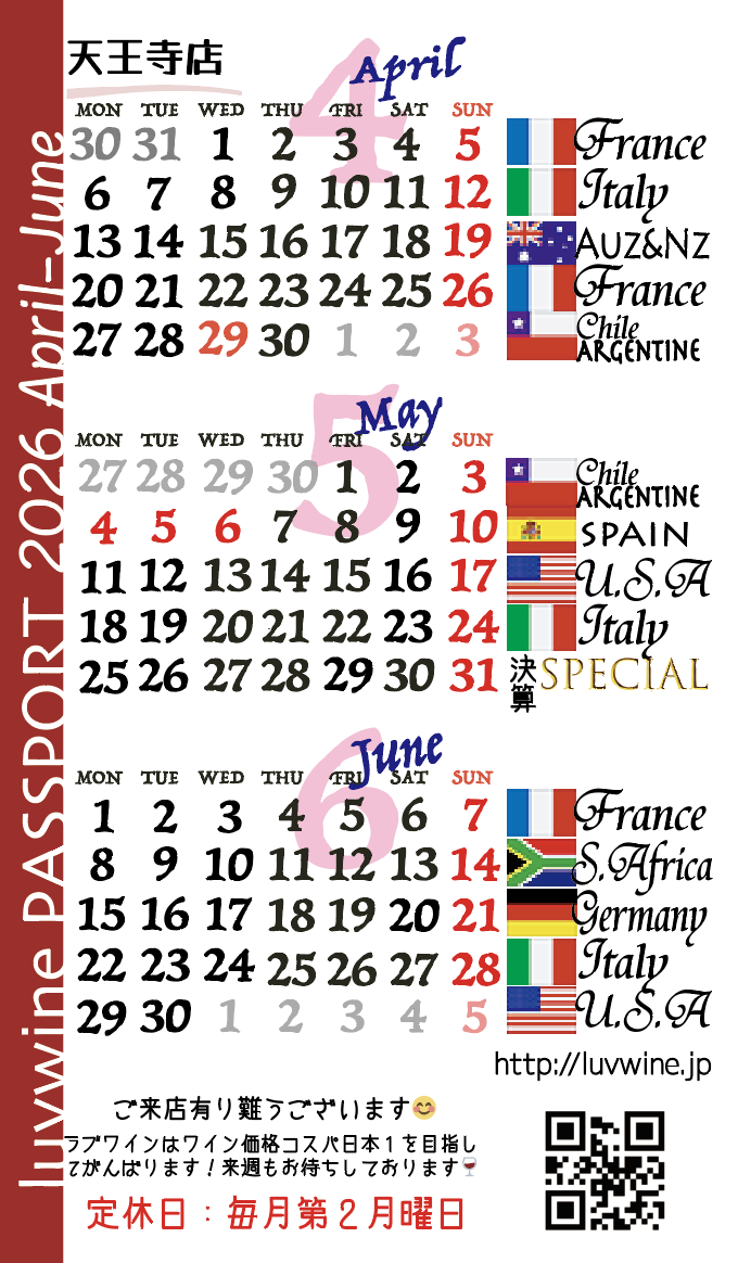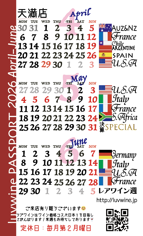 週替わりワインメニュー・フードメニュー・ワインカレンダー